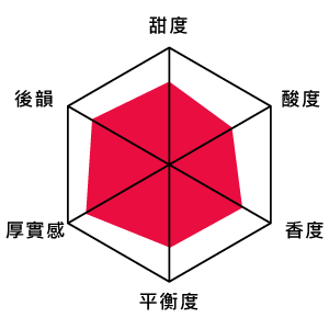 風味迷人的花香與(核果)堅果甜香,口感均衡細膩無雜味,不苦不澀,滑順好入喉,輕微果酸,尾勁甘甜並具焦糖香,回甘吉強且持久。